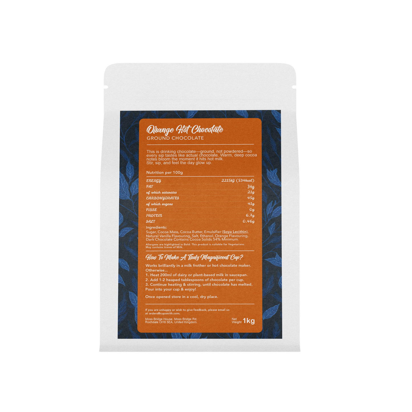 Our outer box is fully recyclable and the inner bag is plastic-free and biodegradable. We proudly use 100% slave-free Colombian chocolate, carefully flaked and packed by us at Cupsmith.